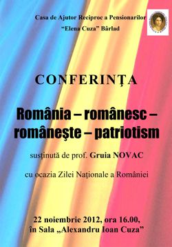 Conferința "România - românesc - românește - patriotism", 22 noiembrie 2012, ora 16,00 la sediul Casei în Sala "Alexandru Ioan Cuza" ...detalii