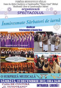 Spectacolul "Înmiresmate Sărbători de iarnă" dedicat Crăciunului și Anului Nou, sâmbătă 15 decembrie 2012, ora 16.00 la Casa de Cultură "George Tutoveanu" Bârlad. Intrarea liberă.