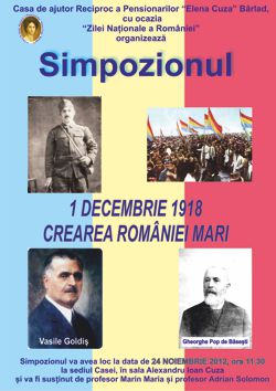 Simpozionul "1 Decembrie 1918 Crearea României Mari", 24 noiembrie 2012, ora 11,30 la sediul Casei în Sala "Alexandru Ioan Cuza"