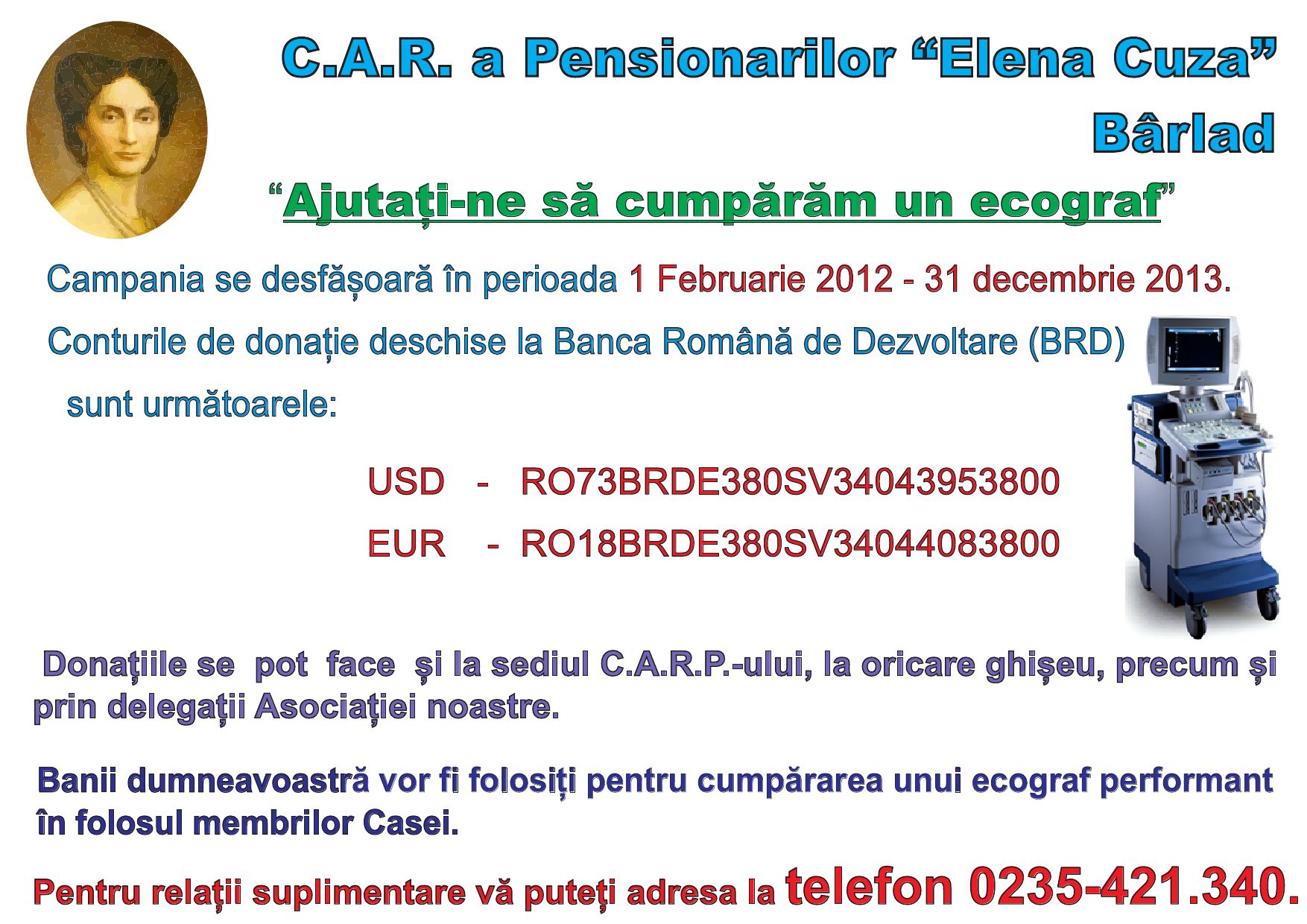 C.A.R. Pensionari "Elena Cuza" Barlad organizeaza pe 20 aprilie 2012,