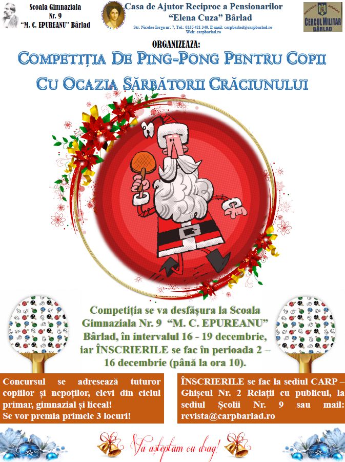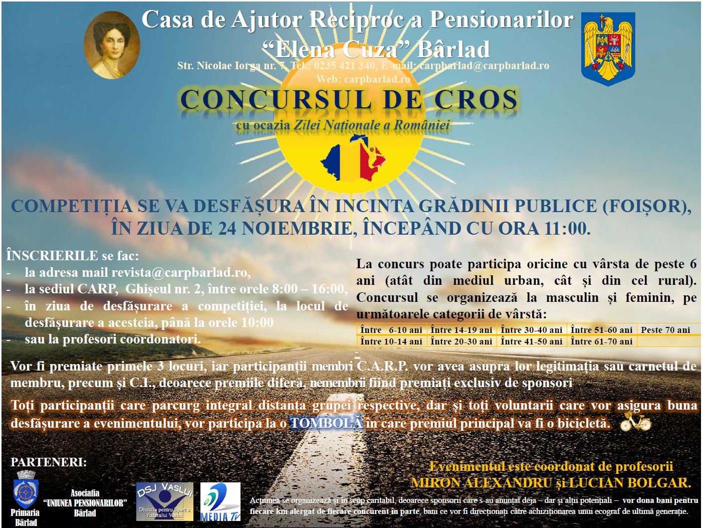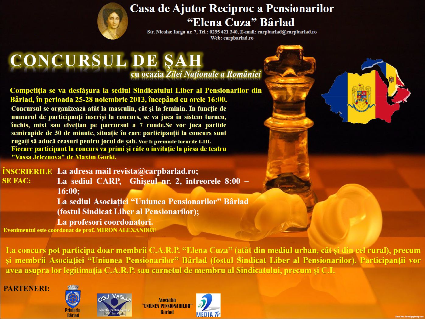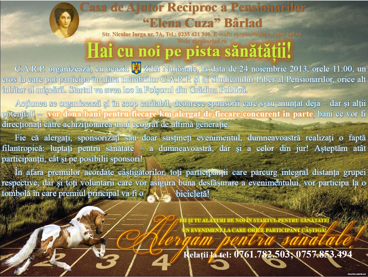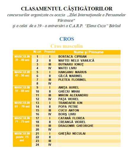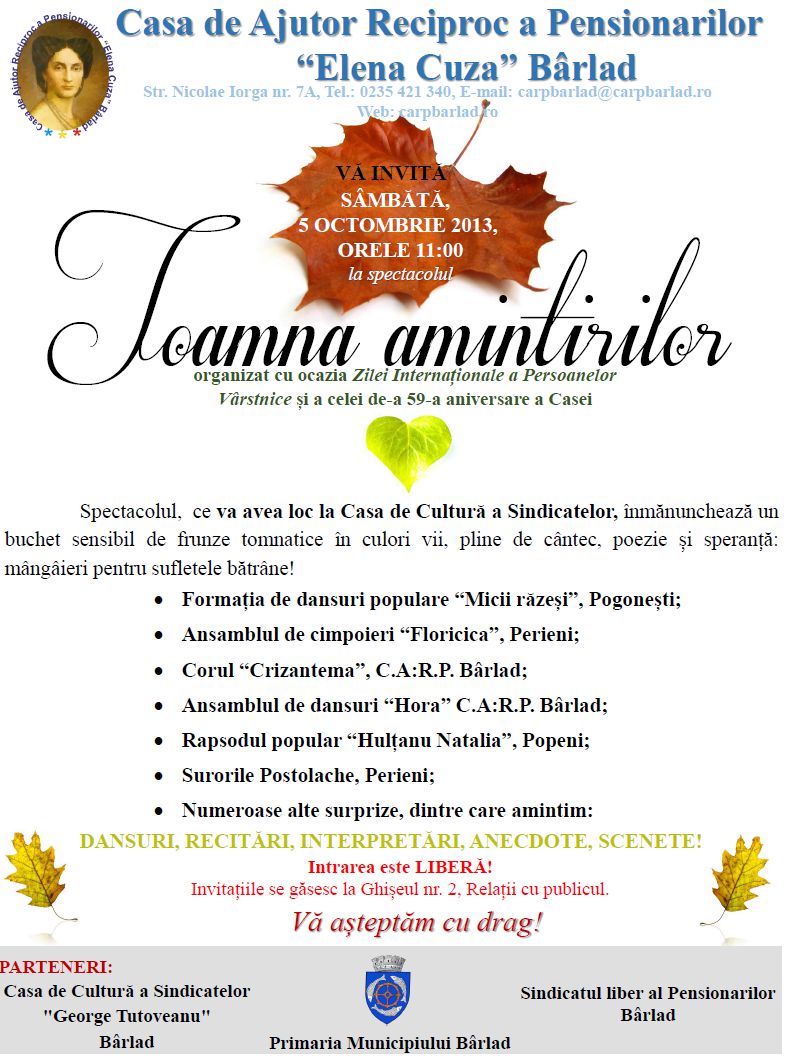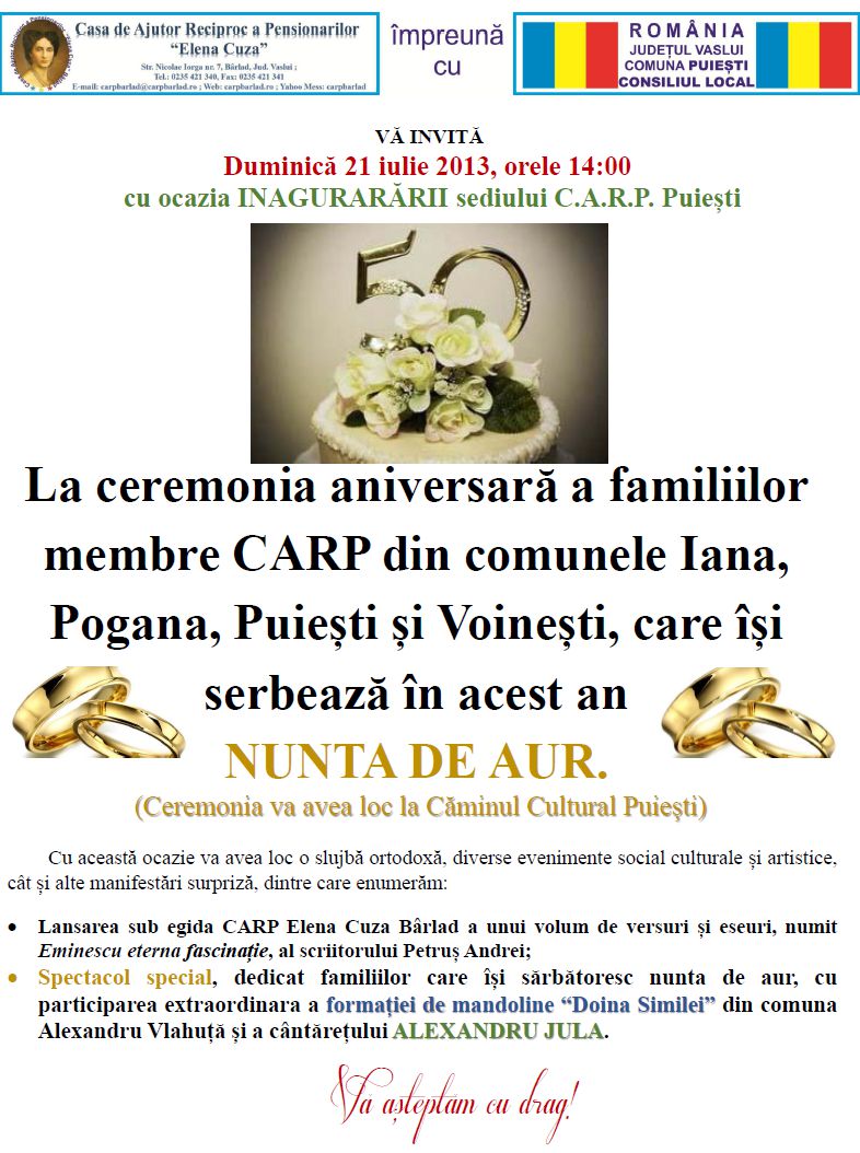 Cu ocazia Zilei Internaționale a Persoanelor Vârstnice (1 Octombrie) și a Zilei Asociației noastre (8 Octombrie) vor fi sărbătorite acele cupluri, membre ale C.A.R.P. "Elena Cuza" Bârlad, care în acest an împlinesc 50 de ani de la căsătorie. Rugăm aceste cupluri să se prezinte în perioada 19 Martie - 30 Septembrie la sediul nostru din Bârlad sau la sediul sucursalelor din teritoriu pentru a fi luate în evidență pe baza următoarelor înscrisuri și documente: carnetul de membru al fiecărui soț, certificatul de căsătorie și B.I. sau C.I. al fiecărui soț.