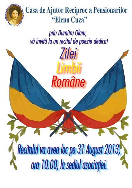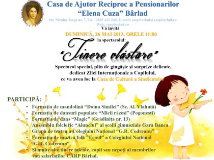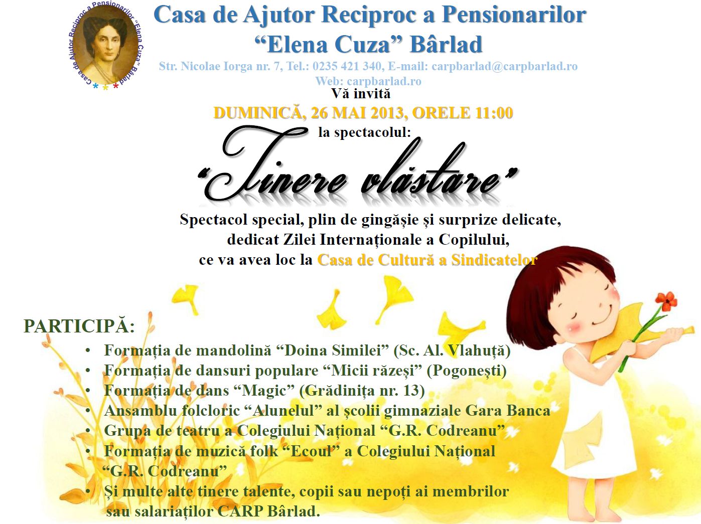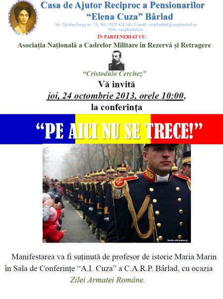 Casa de ajutor reciproc a pensionarilor „Elena Cuza” din Bârlad vă invită miercuri, 6 martie 2013, orele 17, la manifestarea “Femeia în percepția societății și civilizației”, manifestare dedicată zilei de 8 martie (Ziua internațională a femeii ). Tema va fi prezentată de domnul profesor Gruia Novac, în sala “Alexandru Ioan Cuza” din incinta unității. Vă așteptăm cu drag.