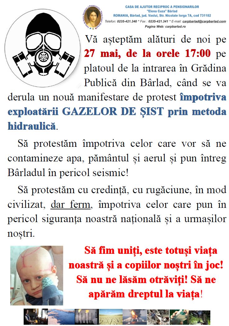 Vă așteptăm alături de noi pe 27 mai, de la orele 17:00 pe platoul de la intrarea în Grădina Publică din Bârlad, când se va derula o nouă manifestare de protest împotrivaexploatării GAZELOR DE ȘIST prin metoda hidraulică.