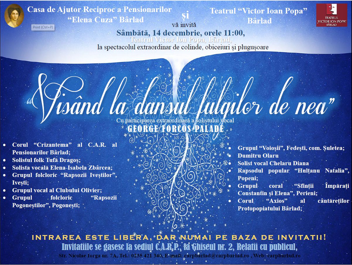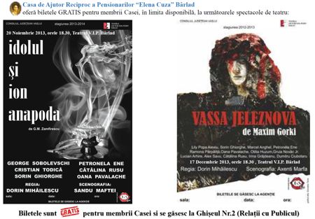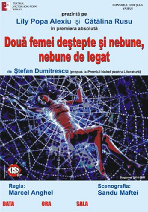 Casa de Ajutor Reciproc a Pensionarilor “Elena Cuza” din Bârlad invită membrii săi la spectacolul teatrului V.I.Popa “Două femei deștepte și nebune, nebune de legat”, pe data de 17 Mai, ora 18.00. Distributia spectacolului este urmatoarea: Lily Popa Alexiu si Catalin Rusu Regia: Marcel Anghel Scenografia: Sandu Maftei