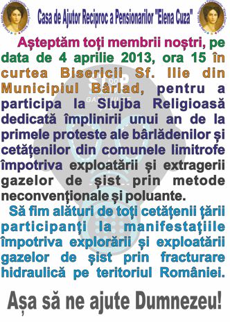 Mesajul CARP „Elena Cuza” Bârlad pentru marșul de protest împotriva exploatării GAZELOR DE ȘIST prin metoda hidraulică, miercuri, 27 februarie 2013 | ||