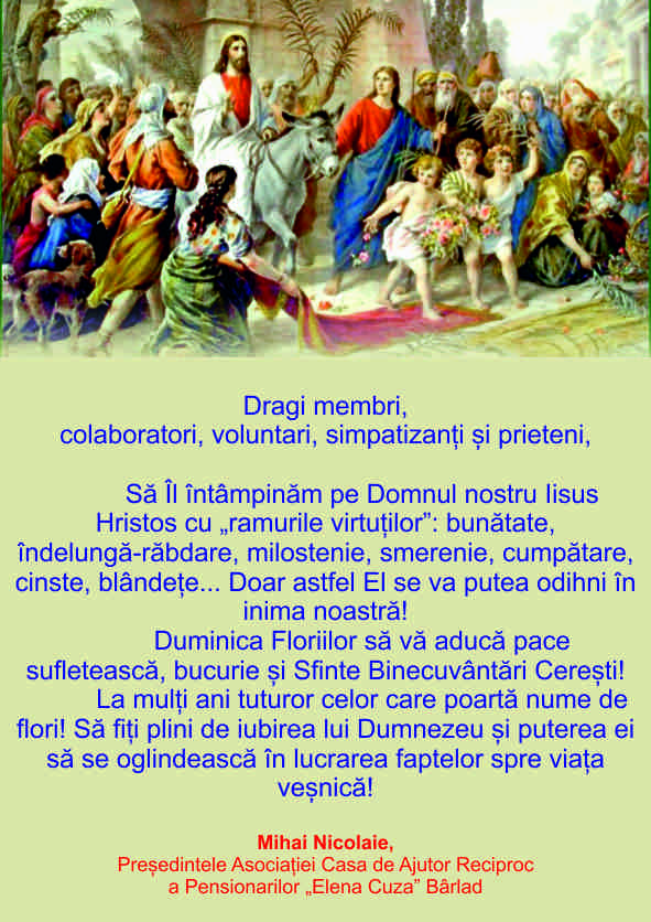 Dragi membri, colaboratori, simpatizanți, angajați, voluntari și prieteni ai Asociație Casa de Ajutor Reciproc a Pensionarilor „Elena Cuza”, din Bârlad, Vă dorim un Paște luminos și binecuvântat! În aceste zile sfinte, când sărbătorim Învierea Domnului nostru Iisus Hristos, ne umplem sufletele de nădejde și bucurie, conștientizând că lumea aceasta nu reprezintă destinația noastră finală, ci mântuirea noastră întru Adevăr. Acest gând ne întărește și ne ajută să trecem cu ușurință și speranță peste provocările lumii și a dezastrelor pe care cei care au uitat de Dumnezeu le aduc în viața noastră! Cu toate că noi, ca români, trecem printr-o o perioadă mai grea, marcată de incertitudine și provocări, am demonstrat – ca întotdeauna – reziliență și solidaritate: împreună, ca o familie. Apreciem...