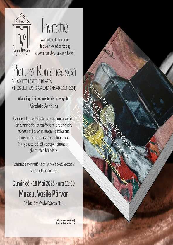 Invită membrii săi la un eveniment de excepție pentru cei care sunt interesați de lucrările de artă importante din colecțiile Muzeului Vasile Pârvan din Bârlad: Lansarea volumului PICTURĂ‚ ROMÂNEASCĂ‚ DIN COLECȚIILE SECȚIEI DE ARTĂ‚ A MUZEULUI "VASILE PÂRVAN" BÂRLAD (1914-2004). Albumul este îngrijit și documentat de regretata doamnă Nicoleta Arnăutu, muzeograf și fost director al Muzeului Vasile Pârvan. Lansarea va avea loc Duminică, 18 mai 2025, ora 11, la sediul principal al Muzeului Vasile Pârvan, str. Vasile Pârvan, nr 1.