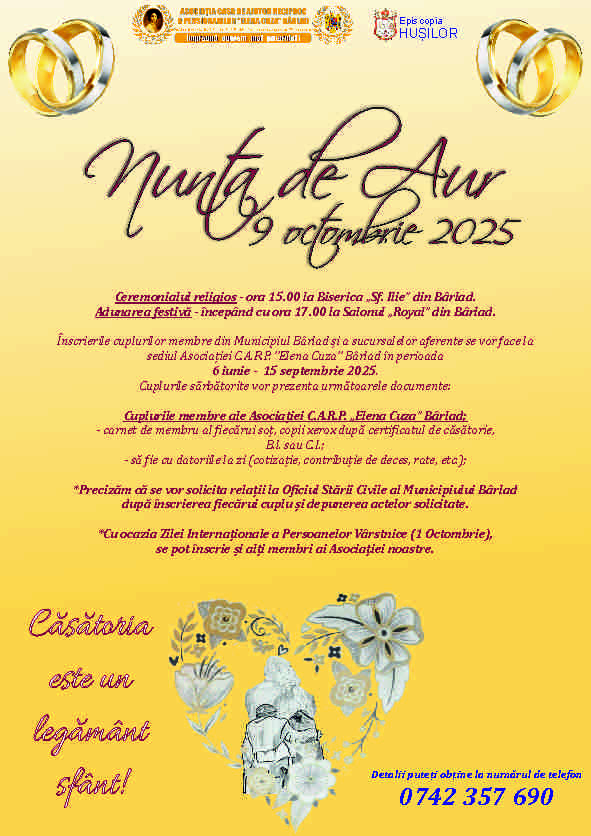 Ceremonialul religios - ora 15.00 la Biserica „Sf. Ilie” din Bârlad.Adunarea festivă - începând cu ora 17.00 la Salonul „Royal” din Bârlad.Înscrierile cuplurilor membre din Municipiul Bârlad și a sucursalelor aferente se vor face la sediul Asociației C.A.R.P. ”Elena Cuza” Bârlad în perioada 6 iunie - 15 septembrie 2025.Cuplurile sărbătorite vor prezenta următoarele documente: Cuplurile membre ale Asociației C.A.R.P. „Elena Cuza” Bârlad; - carnet de membru al fiecărui soț, copii xerox după certificatul de căsătorie, B.l. sau C.I.; - să fie cu datoriile la zi (cotizație, contribuție de deces, rate, etc.);Precizăm că se vor solicita relații la Oficiul Stării Civile al Municipiului Bârlad după înscrierea fiecărui cuplu și depunerea actelor solicitate.Cu ocazia Zilei Internaționale a Persoanelor Vârstnice (1 Octombrie), se pot înscrie și alți membri ai Asociației noastre.