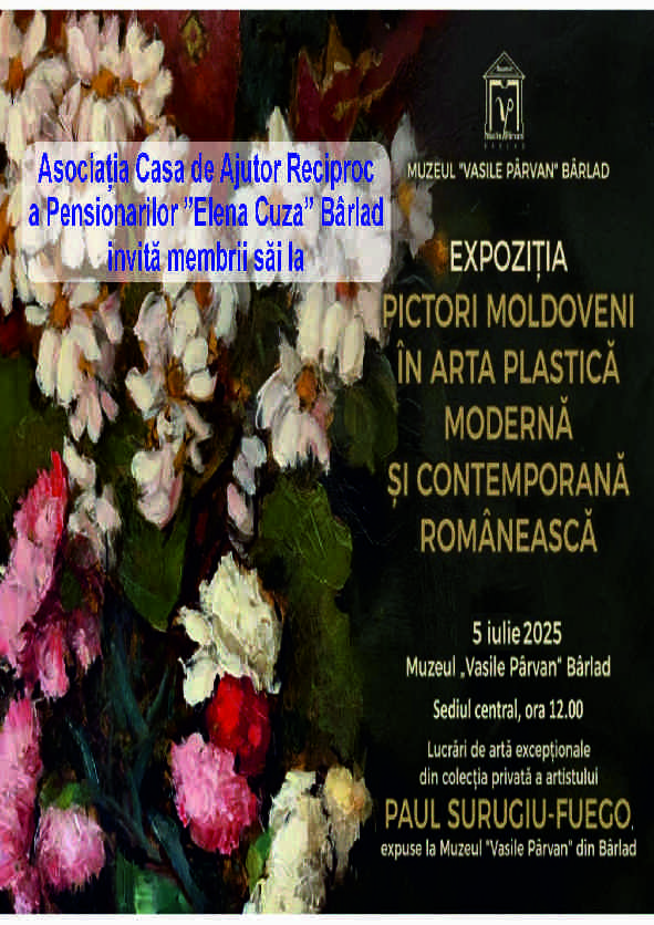 Muzeul „Vasile Pârvan” Bârlad vă invită la vizionarea expoziției de artă, derulată sub genericul PICTORI MOLDOVENI ÎN ARTA PLASTICĂ‚ MODERNĂ‚ ȘI CONTEMPORANĂ‚ ROMÂNEASCĂ‚ – cuprinzând lucrări excepționale de artă, din colecția artistului Paul Surugiu - Fuego Muzeul „Vasile Pârvan” Bârlad are plăcerea și bucuria de a realiza, cu mijloace muzeistice, o mică incursiune, având drept punct de plecare pasiunea de colecționar a îndrăgitului artist Paul Surugiu – Fuego, care pe lângă plăcerea de a cânta a fost prins în mrejele artelor plastice, transformându-se treptat într-un veritabil colecționar, dar în același timp și într-un autodidact în ale picturii pe șevalet. Începând, poate, de la plăcerea de a picta a apărut, la un moment dat dorința de a colecționa. Sau cine știe, este posibil ca lucrurile să fi stat invers. Oricare ar fi fost calea, cert este că cele două...