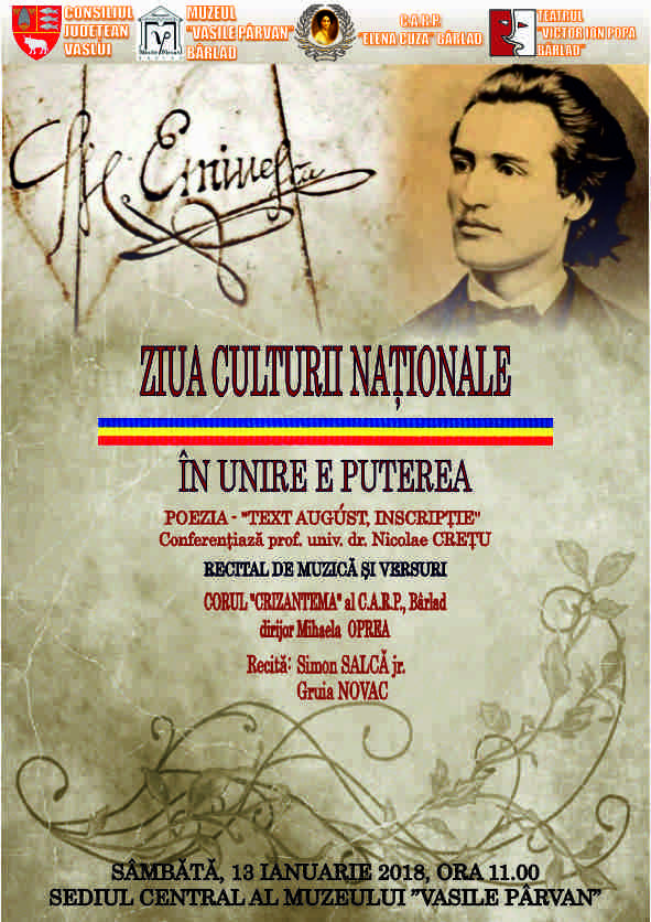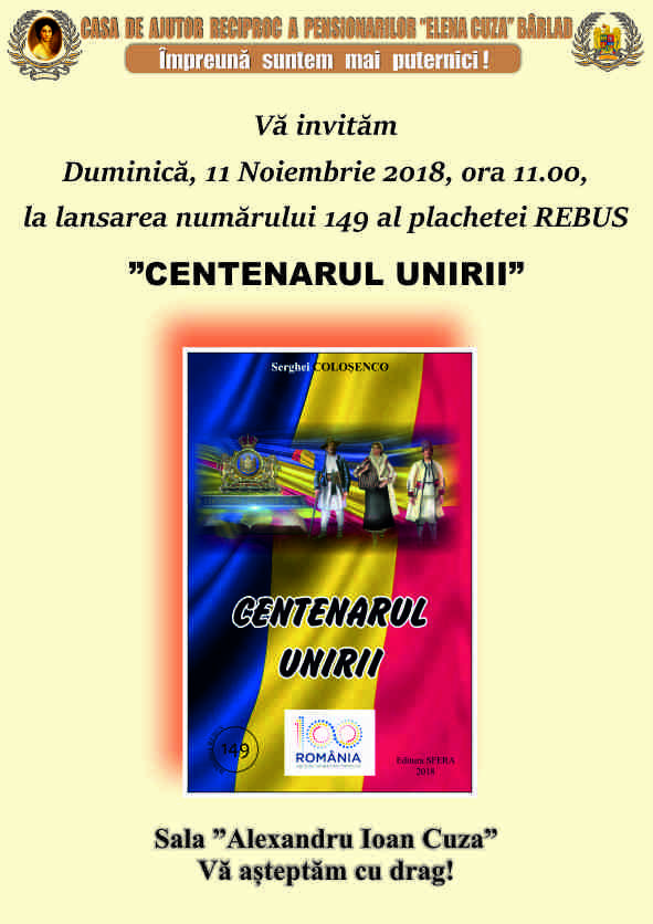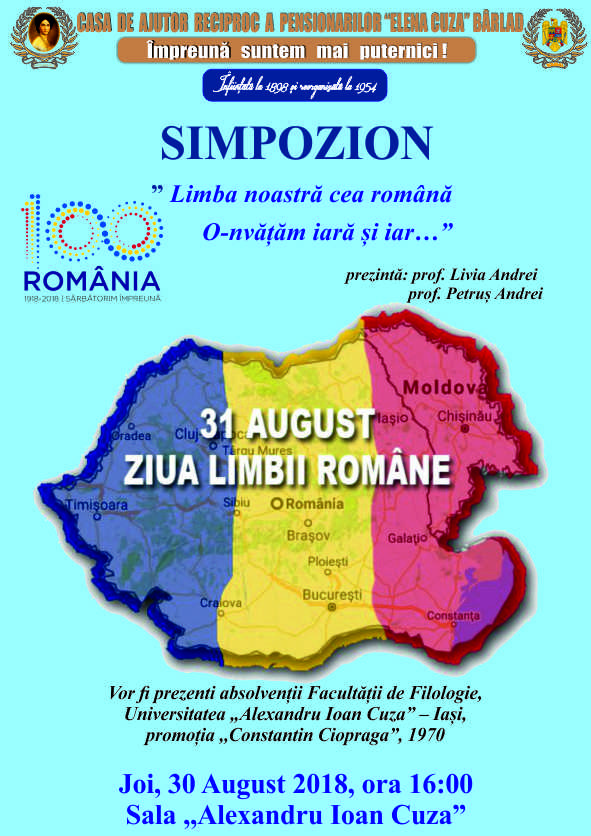 Casa de Ajutor Reciproc a Pensionarilor Elena Cuza din Bârlad vă invită vineri, 27 iulie 2018, ora 11.00 la simpozionul IMNUL-SIMBOLUL UNITĂȚII ȘI IDENTITĂȚII NOASTRE NAȚIONALE