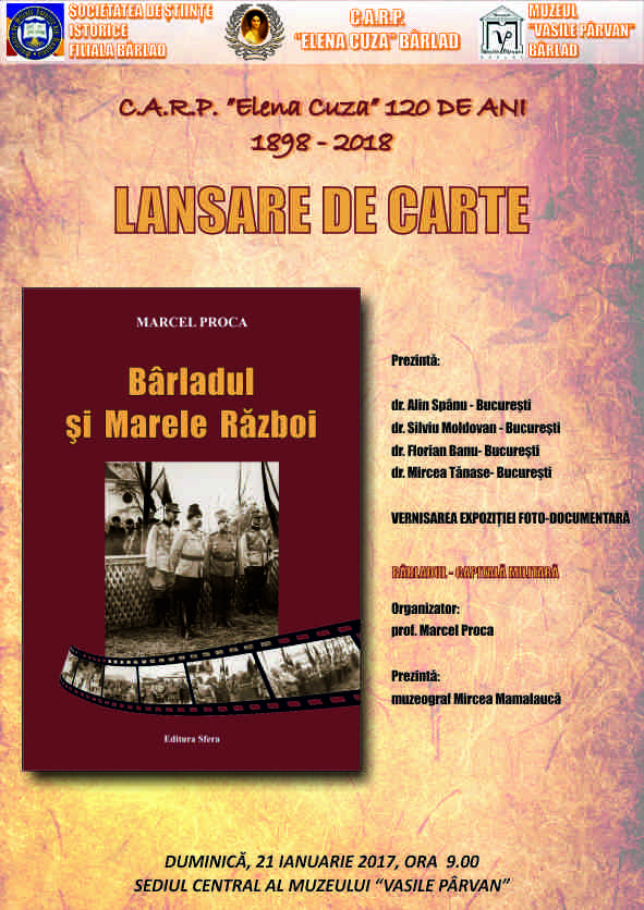 Duminică, 21 ianuarie 2018, a avut loc lansarea cărții Bârladul și Marele Război, autor prof. Marcel Proca, la sediul Muzeului Vasile Pârvan. Manifestarea se înscrie în cadrul evenimentelor prilejuite de sărbătorirea a 120 de ani de la înființarea Casei de Ajutor Reciproc a Pensionarilor Elena Cuza Bârlad și a fost găzduită cu generozitate și profesionalism de Muzeul Vasile Pârvan. Cartea a fost prezentată de dr. Alin Spânu (reputat specialist în istoricul serviciilor de informații românești din timpul Primului Război Mondial și nu numai) professor la Facultatea de istorie din cadrul Universității București, dr. Silviu Moldovan directorul departamentului cercetare din cadrul CNSAS și dr. Florian Banu - din cadrul aceleiași instituții. Discuțiile au fost moderate de directorul Muzeului Vasile Pârvan prof. Mircea Mamalaucă, care a vernisat și expoziția foto-documentară...