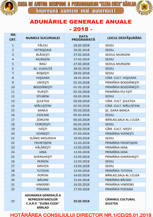 Activitățile dedicate celei de a 120-a aniversări a Casei de Ajutor Reciproc a Pensionarilor Elena Cuza Bârlad se vor desfășura în perioada 20 ianuarie 2018, ora 14.00 22 ianuarie 2018.