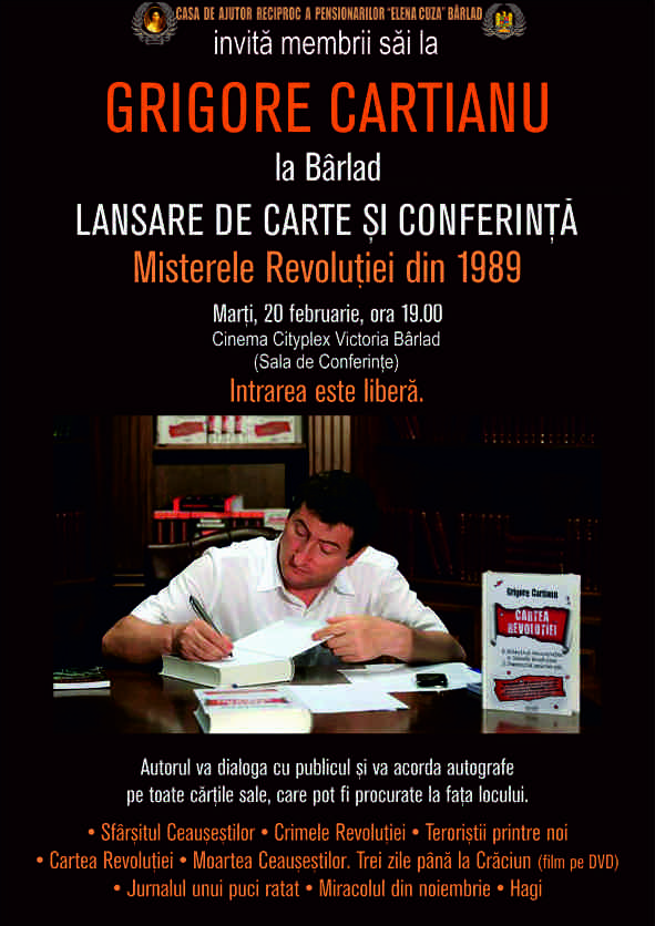 Marți, 20 februarie 2018, ora 19.00, la Cinema Cityplex Victoria Bârlad, va avea loc lansarea cărții "Misterele Revoluției din 1989", autor Grigore Cartianu. Autorul va acorda autografe pe toate cărțile sale, care vor putea fi procurate la fața locului.