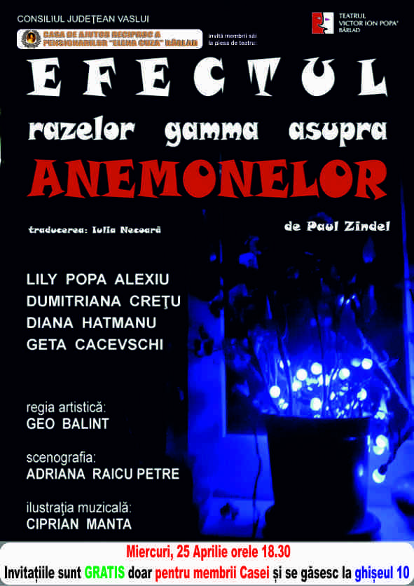 Efectul razelor gamma asupra anemonelor de Paul Zindel Nucleul piesei este concentrat pe relația dintre trei femei - mama și două fiice - care se străduiesc să trăiască într-o casă (fost aprozar) în care nimic nu este cum ar trebui să fie. Spectacolul este despre vise și speranțe neîmplinite, despre o viață sinonimă cuvântului chin. Beatrice (Lily Popa Alexiu) - o femeie tânără încă, dar îmbătrânită, puternică, dar tristă - se sacrifică pentru fete, dar cu reproș, e tandră, dar e și rece... Acest amestec de sentimente și trăiri contradictorii vine din faptul că viața ei, așa cum și-a visat-o, s-a închis în momentul în care au apărut fetele... Prin urmare, fetele sunt înconjurate de ura, iubirea, tandrețea, nebunia, grija și reproșul unei mame a cărei existență e ca o agonie în care le ține prizoniere și pe fete. Rezultatul? Ruth cea rebelă (Dumitriana Crețu) se revoltă, în ea pulsează...
