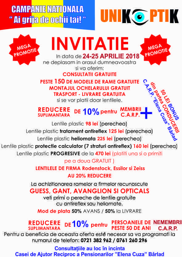 Casa de Ajutor Reciproc a Pensionarilor "Elena Cuza" din Bârlad vă invită la programul artistic-literar "Onoare,Cinstire, Recunoștință Hainei Militare și Eroilor Națiunii Unite!!!", ce se va desfășura în Sala Mare a Cercului Militar Bârlad, marți, 23 octombrie, ora 17.00. Vă așteptăm cu drag!