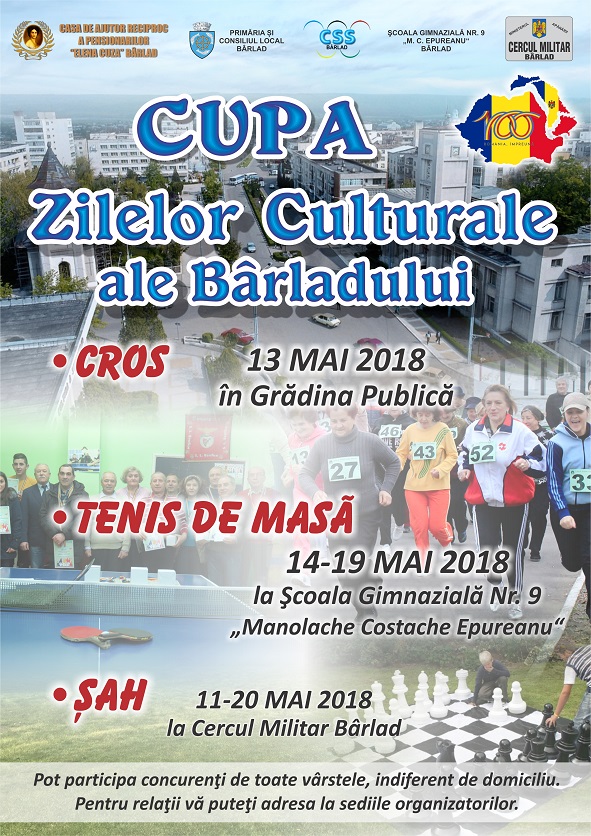 Casa de Ajutor Reciproc a Pensionarilor Elena Cuza din Bârlad vă invită să participați la Cupa Zilelor Culturale ale Bârladului, ce se va desfășura în perioada 13-20 mai! Se vor organiza competiții de cros, șah, tenis de masă.