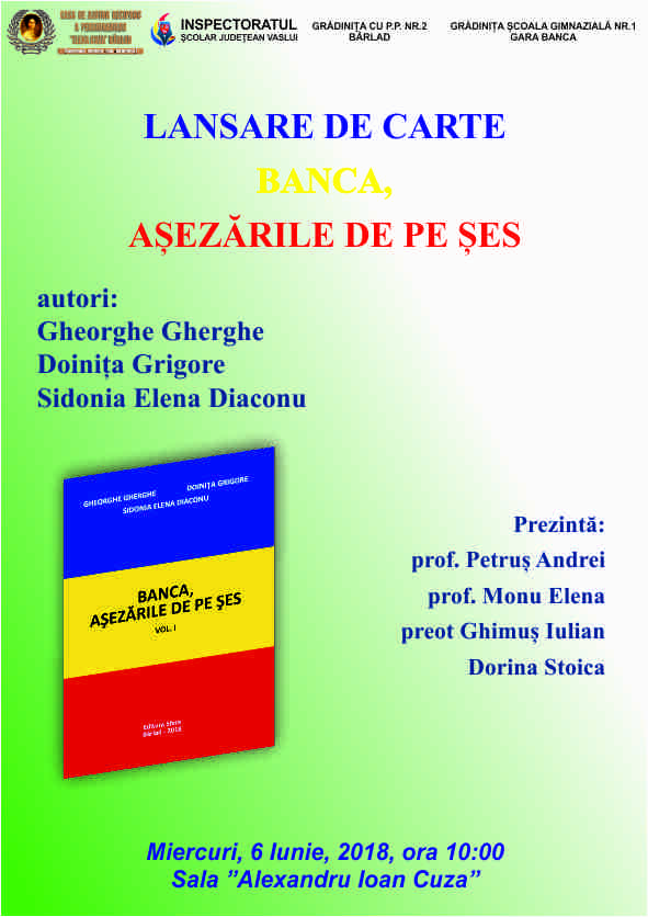 Casa de Ajutor Reciproc a Pensionarilor Elena Cuza din Bârlad vă invită să participați la lansarea carții Banca, așezările de pe șes, autori prof. Gheorghe Gherghe, prof. Grigore Doinița și Sidonia Elena Diaconu. Evenimentul va avea loc miercuri, 6 iunie 2018, ora 10.00 în Sala Al. I. Cuza a Casei. Vă așteptăm cu drag!