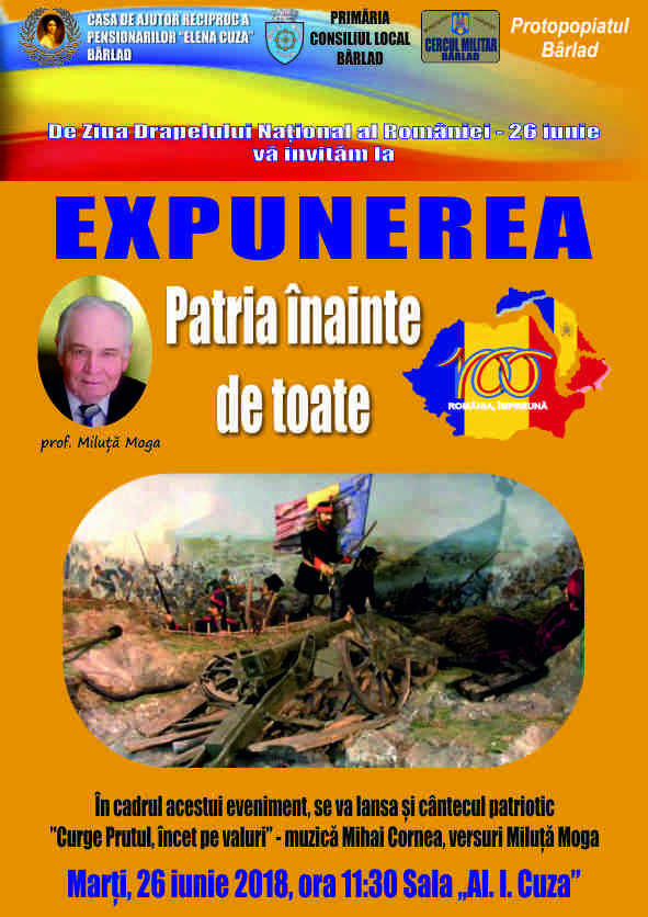 Casa de Ajutor Reciproc a Pensionarilor Elena Cuza Bârlad vă invită să participați la expunerea: Patria înainte de toate. Evenimentul va avea loc marți, 26 iunie 2018, ora 11.30, în sala Al. I . Cuza.