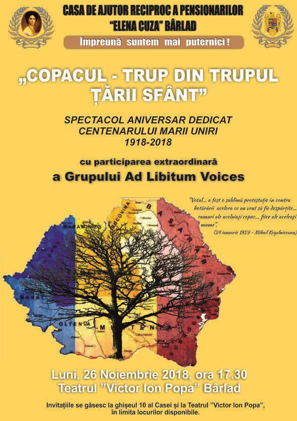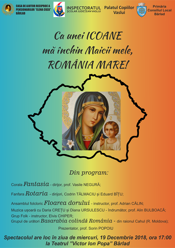 Casa de Ajutor Reciproc a Pensionarilor ,,Elena Cuza’’ Bârlad, alături de Inspectoratul școlar Județean Vaslui, Palatul Copiilor Vaslui și Primăria și Consiliului Local Bârlad vă invită să participați la spectacolul ,,Ca unei ICOANE mă închin Maicii mele, România Mare!’’, pentru a da ton sărbătorilor de iarnă. Evenimentul va avea loc miercuri, 19 decembrie, ora 17:00 la Teatrul ,,Victor Ion Popa’’din Bârlad.