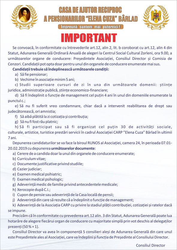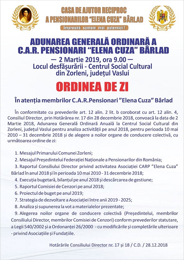 Asociația Casa de Ajutor Reciproc a Pensionarilor ,,Elena Cuza’’ din Bârlad, din dorința de a asigura contactul direct cu legiuitorii în ceea ce privește problemele vârstei a treia, a organizat o conferință în jurul situației pensiilor. Invitații, deputatul Marius Budăi Constantin, fostul Ministru al Muncii și Justiției Sociale și deputatul Adrian Solomon, președintele Comisiei pentru Muncă și Protecție Socială, au stat la dispoziția publicului pentru a clarifica toate problemele legate de pensii și pentru a lămuri care vor fi viitoarele modificări ce vor influența calcularea lor. Din caza unor probleme apărute în ultimul moment, economistul Robu Vasilică – Director la Casa Națională de Pensii și Georgică Bădărău - Secretarul General al Federației Naționale „Omenia” nu au putut fi prezenți la eveniment. Bazele sistemului de securitate socială din România au fost puse înainte de Primul Război Mondia...