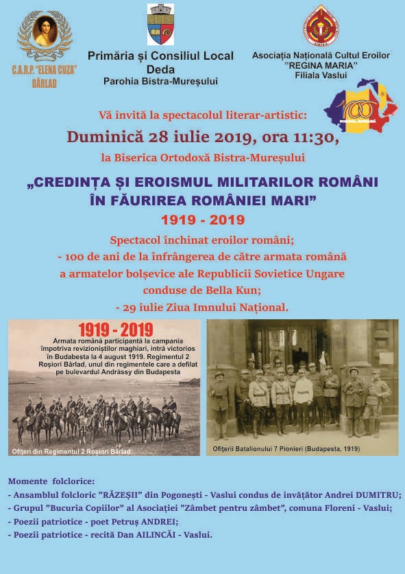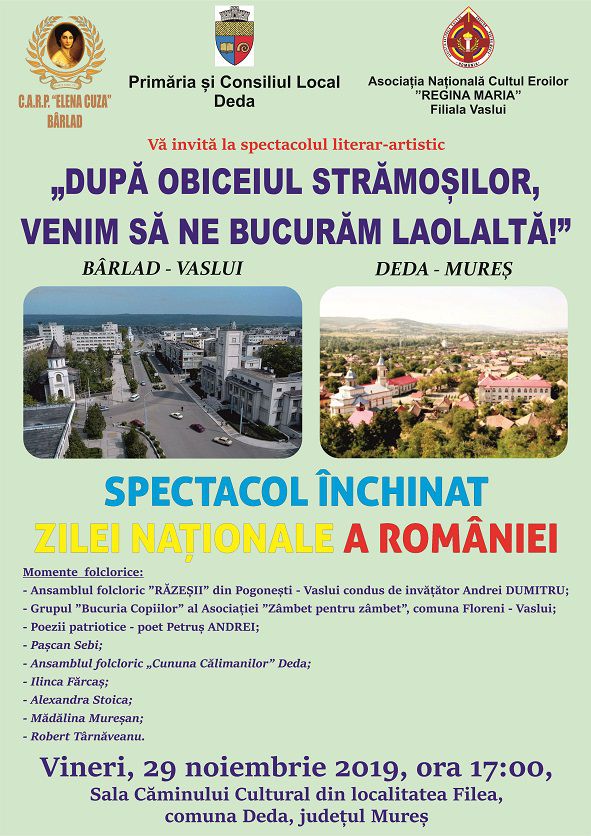Să ne bucurăm românește! Spectacol literar-artistic dedicat Zilei Naționale a României Există perioade în istoria fiecărui popor când acesta trebuie să se întoarcă la valorile tradiționale, la obiceiurile strămoșești și la înțelepciunea generațiilor trecute pentru a supraviețui și pentru a-și redefini rolul în această lume. Cu ocazia zilei de 1 decembrie, Casa de Ajutor Reciproc a Pensionarilor ,,Elena Cuza’’ din Bârlad, Primăria și Consiliul Local Deda și Asociația Națională Cultul Eroilor ,,Regina Maria’’ – filiala Vaslui au considerat că este un moment oportun de a ne întoarce la rădăcini, organizând spectacolul literar-artistic numit ,,După obiceiul strămoșilor, venim să ne bucurăm laolaltă!’’ Acest spectacol a fost menit să aducă în prim plan bogăția moștenirii cultural-artistice lăsate de strămoșii noștrii. Totodată, el reprezintă un omagiu adus celor care au făcut posibilă înfăptui...
