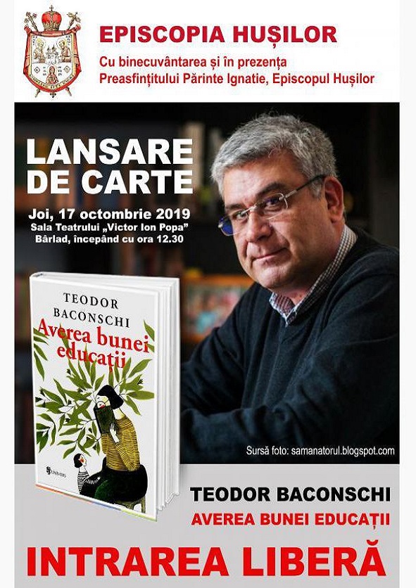 Joi, 17 octombrie 2019, Bârladul a fost gazda unui eveniment cultural deosebit ce l-a avut în prim plan pe domnul Teodor Baconschi, antropolog religios, diplomat, teolog și politician român. Acesta a lansat cartea ,,Averea bunei educații’’, lucrare în care dumnealui expune puncte pertinente de vedere despre ceea ce înseamnă educația potrivită a copiilor. Putem deduce astfel că opera este menită să vină în special în ajutorul părinților. Deoarece viziunea autorului este în perfect acord cu educația creștin ortodoxă, evenimentul s-a desfășurat cu binecuvântarea Preasfințitului Ignatie, Episcopul Hușilor, astfel activitatea transformându-se într-o consfătuire despre societate și educație. Asociația Casa de Ajutor Reciproc a Pensionarilor ,,Elena Cuza’’ Bârlad, a fost reprezentată de domnul președinte Mihai Nicolaie. Acesta, profitând de bucuria revederii Episcopului și de prezența domnului Baconschi, a pus în...