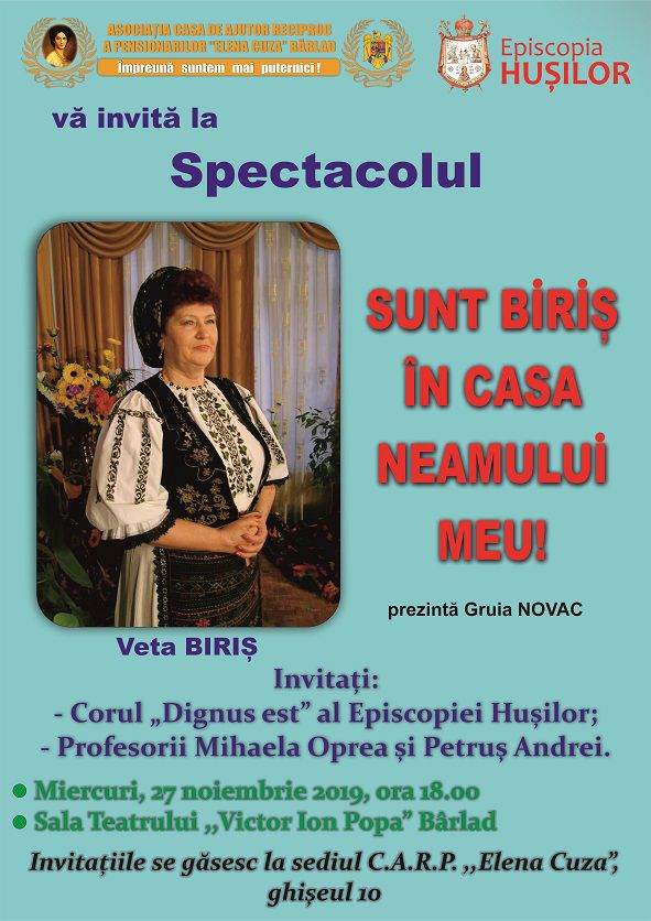 La sfârșitul anotimpului de toamnă, în data de 27 noiembrie, într-o zi de miercuri, Asociația Casa de Ajutor Reciproc a Pensionarilor ,,Elena Cuza’’ din Bârlad, împreună cu Episcopia Hușilor, a organizat o întâlnire de suflet ce a avut-o în prim plan pe interpreta de muzică populară Veta Biriș. Este vorba despre un spectacol în cinstea tradițiilor românești, în cinstea zestrei noastre culturale, cu ocazia sărbătoririi Zilei Naționale a României. Gazda evenimentului a fost domnul profesor Gruia Novac, membru de onoare al Casei de Ajutor Reciproc. Astfel am aflat că titlul spectacolului a pornit de la semnificația cuvântului ,,biriș’’ (argat, slujitor), întreaga activitate fiind un gest de îndeplinire a datoriei față de țară și față de tradițiile strămoșești. Programul literar-artistic a debutat cu Ansamblul Coral al Liceului Pedagogic ,,Ioan Popescu’’ din Bârlad, format din eleve cu voci deosebite, pre...