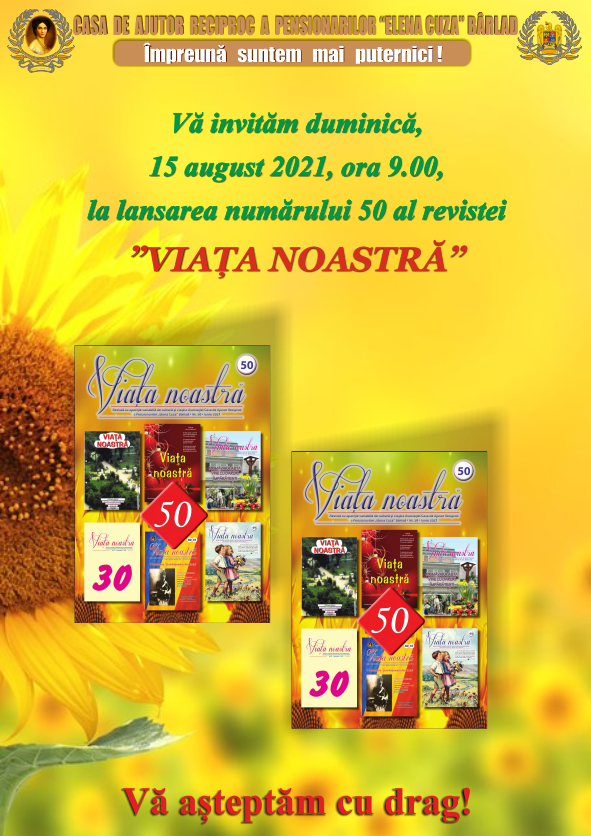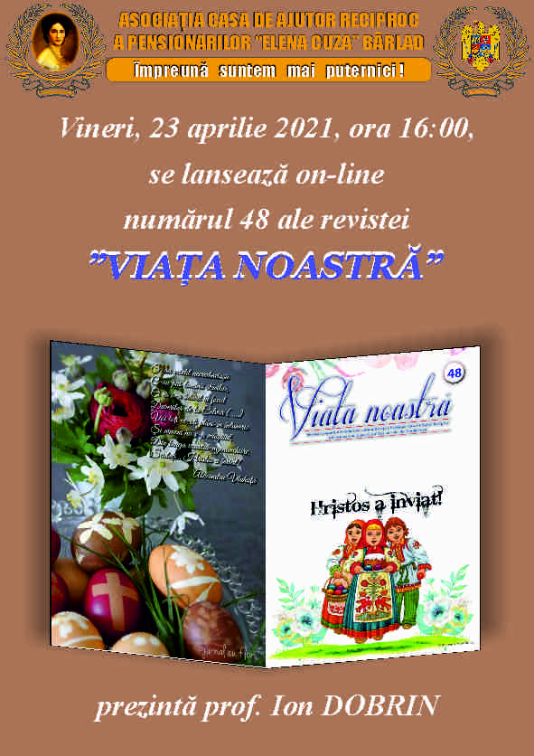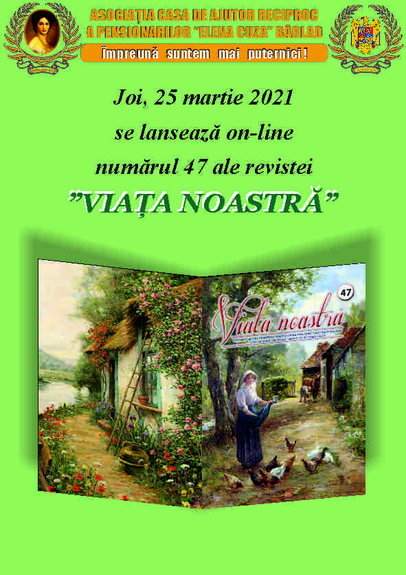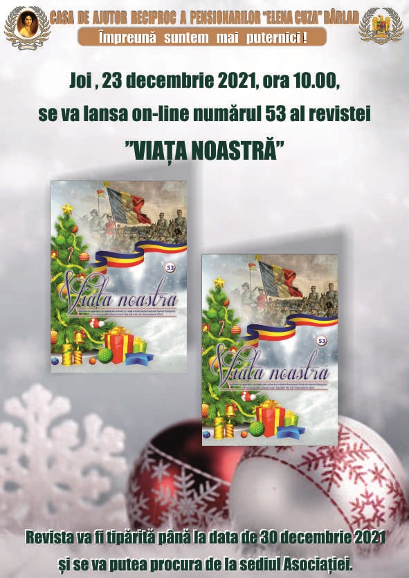 Joi , 23 decembrie 2021, ora 10.00, se va lansa on-line numărul 53 al revistei VIAȚA NOASTRĂ‚ Revista va fi tipărită până la data de 30 decembrie 2021 și se va putea procura de la sediul Asociației.